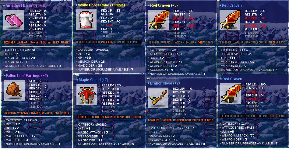 **SELLING LIST** Amethyst Earrings TMA 32 Fallen Leaf Earrings TMA 29 White Doros Robe INT 24 [7 SLOT LEFT] Maple Shield TMA 23 Branch Nose 4 DEX [5 SLOT LEFT] —————————————————— Red Craven 12 LUK 71 WA [4 SLOT LEFT] Red Craven 11 LUK 56 WA [CLEAN] Red Craven 8 LUK 55 WA [CLEAN] Direct message me with offers thank you✨