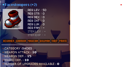 10/0 FS facestomper (+2) 3 clean slate scroll slots available accept cs/ws/mesos cs/ws value 500m Can also PM me in game - boomerstep