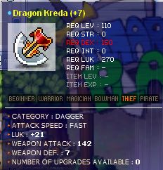 Hi everyone, Selling a 142 att 21 luk Dragon Kreda Dagger (level 100 dagger). Basically like a Kanzir only cooler. 30B STRAIGHT! Accept WS/CS at 490m, 1b coin at 1b. Buyer covers tax. Thank you!