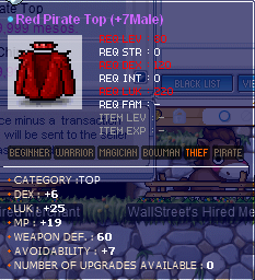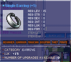 32 dragon khanjar 8 str 2 luk s/b 1.3 a/w 1.5 SOLD 24 att 15 str maplep shield s/b 3.2b a/w 4b SOLD 22 att maple shield + 2.8b top up 15 luk single earring 450m SOLD 6dex/25luk +7 avoid red pirate top (male) 500m SOLD 6dex/25luk +11 avoid red pirate top (male) 500m SOLD 6dex/24luk +6 avoid red pirate top (male) 300m SOLD 6dex/24luk +5 avoid brown china (male) 350m