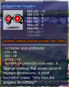 CLEAN Spectrum Goggles 5 STR 7 DEX 2 SPEED S/B: 4.5B C/O: - A/W: 5.5B Accept: B Coin WS/CS @ 500M