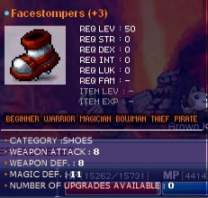 8 ATT Facestompers FS S/B: 2.9 B Currently accepting other items as partial payments or if better than mine, I will top up. This includes: ETC items (Taru totems, Narican jewels, Taos, Erasers, etc) ATT gear (Other capes, gloves, shoes) Scrolled Weapons (Swords, bows, guns, claws, wands, etc) INT Gear (Earring, bathrobes, shields, gloves) Skill books (MW20, GEN20/30, TT30) Alchemist Rings scrolled / clean Stars (Furries, C-Ilbis) Eye equip (only fully scrolled INT / DEX goggles / Raccoon masks) Downgrades / upgrades = 400 M = 400 M = 11 M