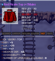 Selling the following items. You can pm me or respond back to this thread. No current offers on any items. Maple dark mate: 102 att 19 luk Rat mouth: 8 dex Red pirate top: 25 luk 5 dex
