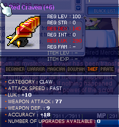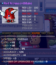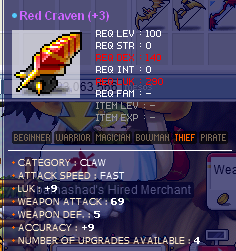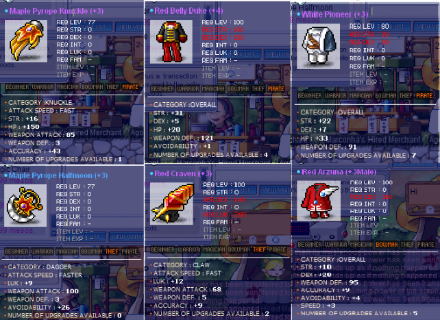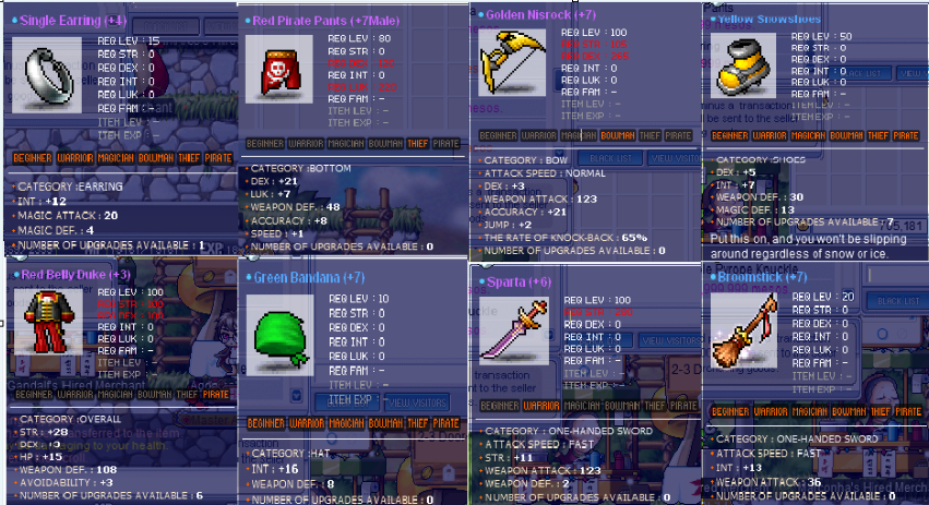 Selling 2-3 Mid IGN [HSIL] 1] Red Belly Duke Str 42 Dex 5 s/b 2.5b a/w 3b 2] Golden Nisrock Dex 3 WA 123 a/w 550m Please feel free to leave offers via forum or at shop [2-3 HSIL] as some may be overpriced. Sold: Spoiler: Items Sold 1] Facestompers WA 9 - s/b 4.1b a/w 4.5b Sold in game as 8ws + 250m 2] PGC WA 13 - s/b 5.9b a/w 6.5b Sold in game as 13cs/ws 3] FS WA5 / 1 slot s/b 1.3b a/w 1.5b Sold in game as s/b 4] Red Lapiz Sandals Int 8 MA 6 s/b 80m a/w 130m Sold in game as a/w 5] PGC WA 13 c/o 5.9b a/w 6.5b - Sold in game as s/b 6] Facestompers WA 11 | 2 slots s/b 12b a/w 14b Traded with Green Ades|Specs|RC 7] BFC WA 16 s/b 15b a/w 16b - Sold at s/b 8] FS WA 10 s/b 5.8b a/w 6.3b - Sold at s/b 9] Red Pirate Top Dex 7 Luk 23 s/b 200m a/w 350m 10] VL WA 5 s/b 650m a/w 800m- Sold in s/b 11] FS WA 10 s/b 5.8b a/w 6.3b - Sold in s/b 12] Red Pirate Pants (Male) Dex17 Luk9 s/b 350m a/w 500m (Not sure of the price. PMO) 13] Single Earring Int 9 MA 15 2 slots a/w 410m - Sold from shop 14] Ended up as Elemental Wand 7, Int 12/MA 168 - Sold at 750m 15] Green Mittens 12 WA 1 slot s/b 900m a/w 1.1b - Sold in game 16] Red Belly Duke 28/4 7 slots s/b 1.2b a/w 1.4b Sold in game as 1b 17] Red Craven Luk 10 WA 70, 4 slots a/w 1b Sold in game a/w 18] Yellow Snowshoes Dex 5 Int a/w 400m Sold at 300m (150m + 15 APR) in game 19] Green Bandana Int 16 a/w 100m - Sold in game a/w 20] 1] Single Earring Int 12 MA 20 1 slot s/b 1b a/w 1.2b - Sold at 1.05b 21] Red Pirate Pants Dex 21 Luk 7 s/b 350m a/w 500m - Sold as 300m 22] Red Craven Luk 9 WA 69 4 slots a/w 850m - Sold at a/w 23] Maple Pyrope Halfmoon Luk 9 WA 100 a/w 50m - Sold at a/w 24] White Pioneer Str 22 Dex 7, 7 slots a/w 650m - Sold at a/w 3] Maple Pyrope Knuckle Str 16 WA 85, 1 slot a/w 250m 4] Red Arzuna Str 10 Dex 38 a/w 700m 10] Broomstick Int 13 a/w 200m 8] Single Earring Int 9 MA 15 2 slots a/w 450m Accepts payment in: CS/WS - 490m each 1b coin (Buyer covers tax)
