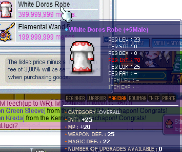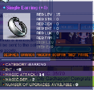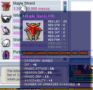 I Have a few items to sell so here we go 26 TMA Maple Shield S/B : 1B A/W : 1.3B 8 Int Racc Mask S/B: 800M A/W: 1B 22 TMA Single Earring S/B:300M A/W:400M 14 TMA PUGC S/B: 250M A/W: 400M 25 INT Doros Robe S/B: 300M A/W: 380M All items are in my shop in Channel 1, FM 6 Door spot, Shop name is : Int Equips