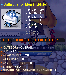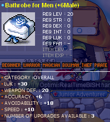 Hey Im selling bathrobes with luk for a very low price compared to 5-10 owls during the day. I got: Two 30LUK 3 SLOTS - c/o 900m a/w 1b ea One 25 LUK 5 SLOTS - c/o 800m a/w 900m One 25LUK 4 SLOTS - c/o 450m a/w 5oom These offers are pretty low for me rn so I won't sell unless someone will make a better one. These aw prices are my limit. Can trade for cs/ws 500m per scroll.