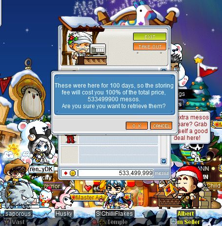 Hi there, I came back on recently , after taking a break, to find that one of the items had sold. So I had some money held by Frederick. The amount of mesos held is shown in the picture. ALSO shown in the picture is the ridiculous ONE HUNDRED PERCENT TAX CUT I will be copping. Is there any reason for this and how can I bypass this??