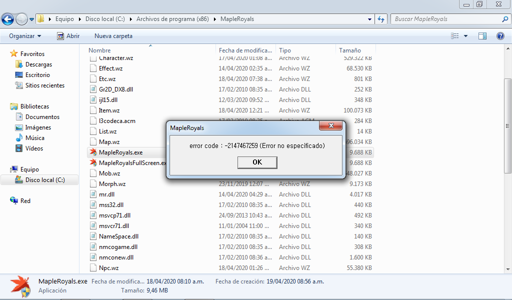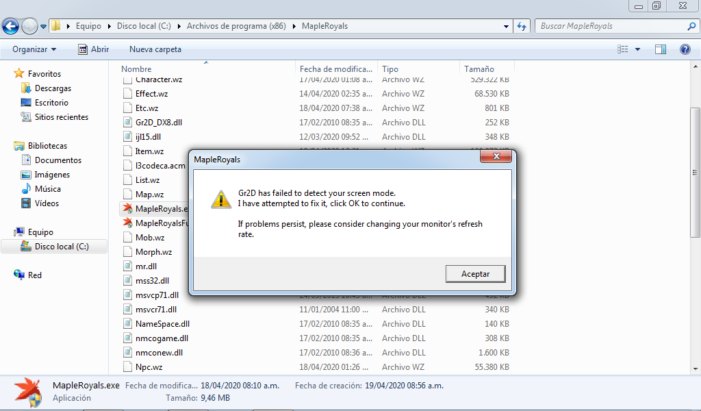 (This message is for developers) I think I know what can be the solution that the developer of Maple can apply, what happens is that in the update they increased the minimum resolution from 800x600 to 1024x768, so that it looks better and this is fine, but what happens is that we have Some users who play from minilaptop and then the maximum resolution of mine, for example, is 1024x600, what I propose is that they do what the original Maple also did, allow 800x600 resolution but with options to change it to the resolution that more they like it. , so that all users can play, here images of the error (anyway I recommend that you study why that happens, so you can patch it)
