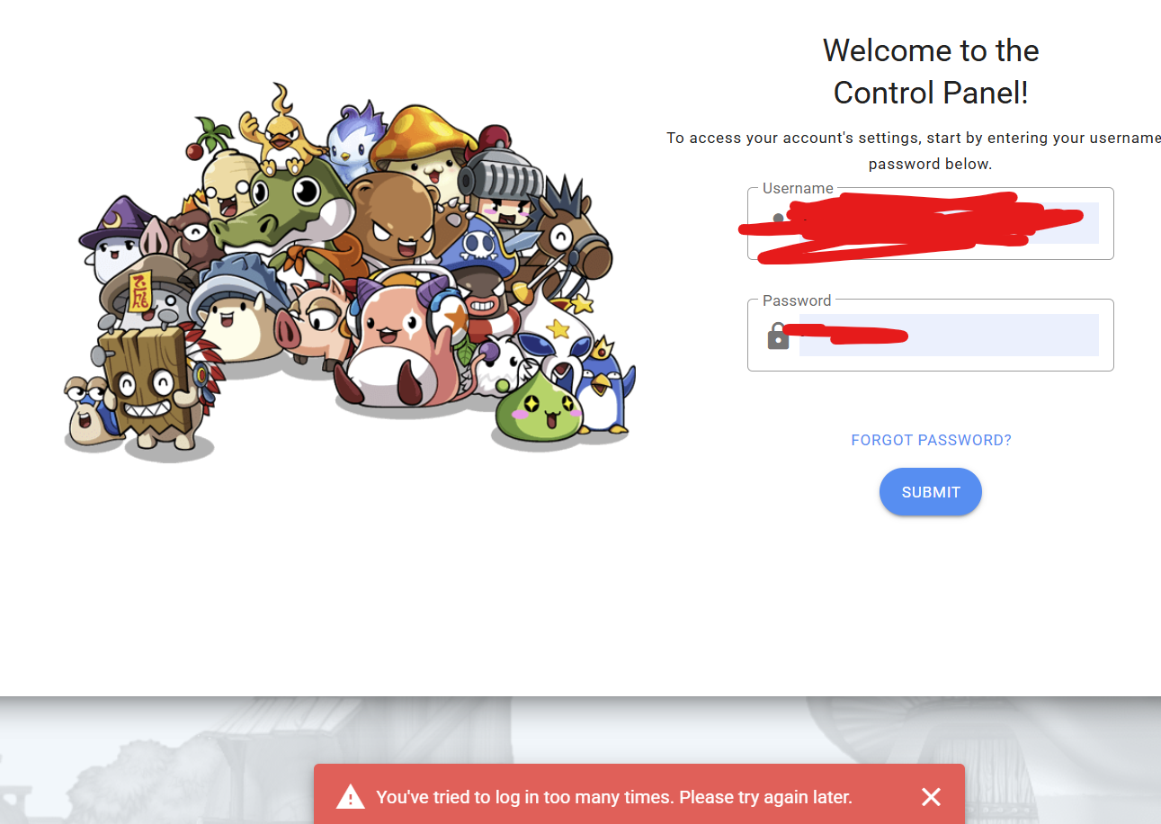 Character Name: Sabreezy Where are you having an issue(s): * Main Website Date and Time when issue(s) occurred (GMT): 26-4-2026 @ 12pm GMT Details of the issue: Hi! I tried accessing the main game where I was prompted to enter my PIN when logging in. I failed it a few times and eventually ended up having to reset my password while following the prompts. To reset my pin though I need to do that from the control panel of the site. When logging into the control panel for the site, I keep getting the error message "You tried to log in too many times, Please try again later". It's been almost a full day since then, and I've tried the following things: * Using mobile device and mobile internet, incognito tabs, different wifi connections, waiting around for a while before trying again. Can someone help? I miss mapling What error code were you given(if any):