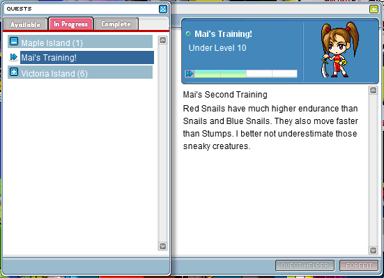 IGN: deafknee Problem: Unable to forfeit quest (Mai's Training!) Details: Once I hit lvl 8, I left Maple Island for Lith Harbour. Since I never will get to continue the quests I picked up, I wanted to forfeit them. But there's this one quest I can't seem to forfeit as the button is grayed out. Please help me!