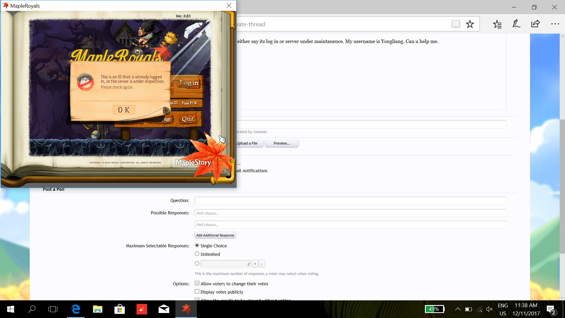 Hi, I'm having issues in logging into my account. I tried logging in but my account will either say its log in or server under maintanence. My username is Yongliang92. Can u help me. Thannk You