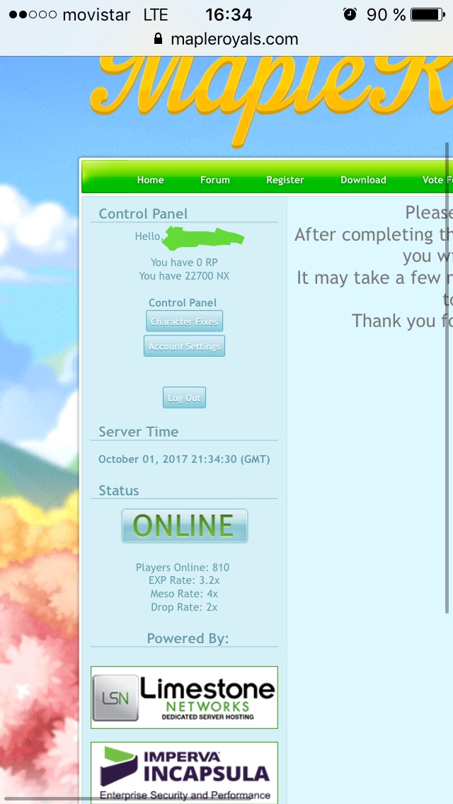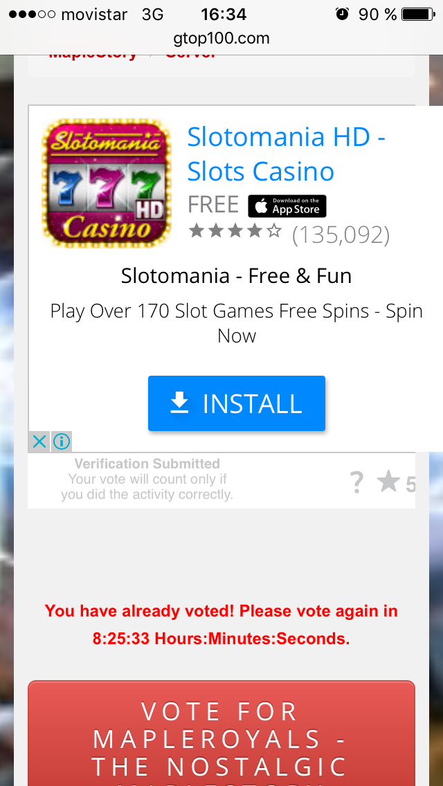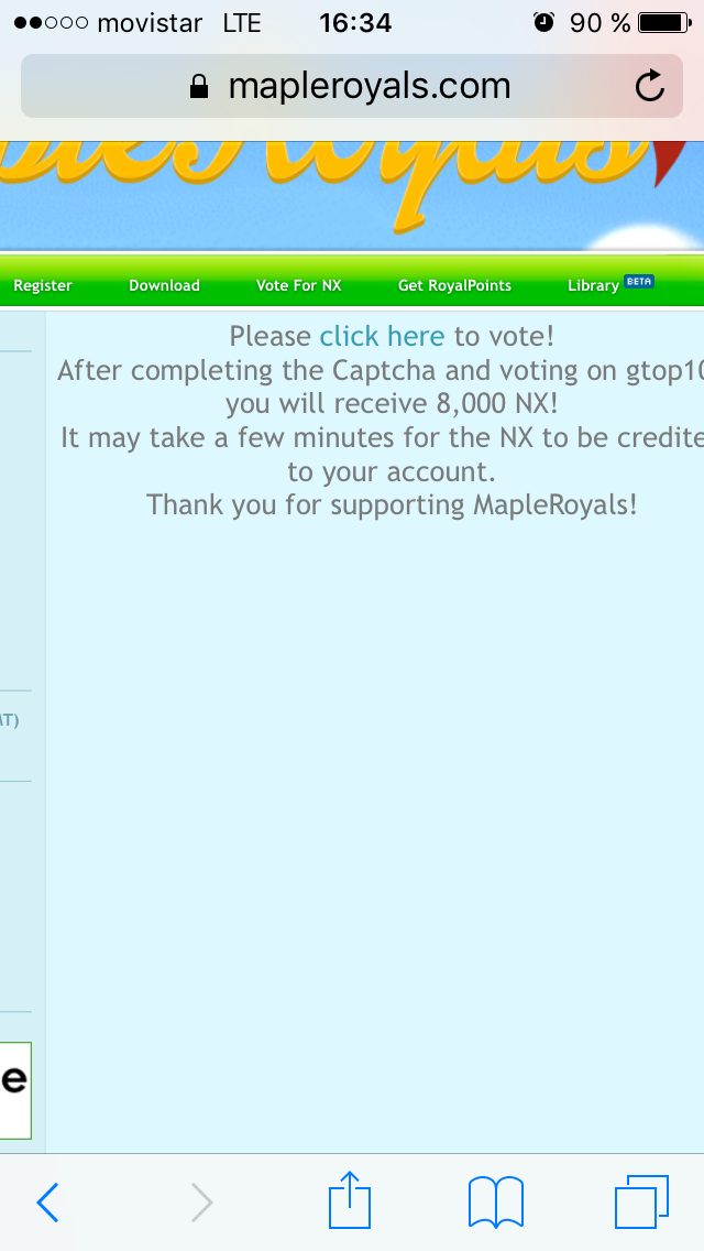Karlost Voted didn't get nx So I successfully voted today in less than 1hr ago( or at least I thought so), so I just checked my nx and I still have 22k nx. I voted to check on mapleroyals site to see if I am on CD which shows I'm not, I followed the steps and went to gtop and it says I have to wait 8 hrs ¿?¿?¿? Lol
