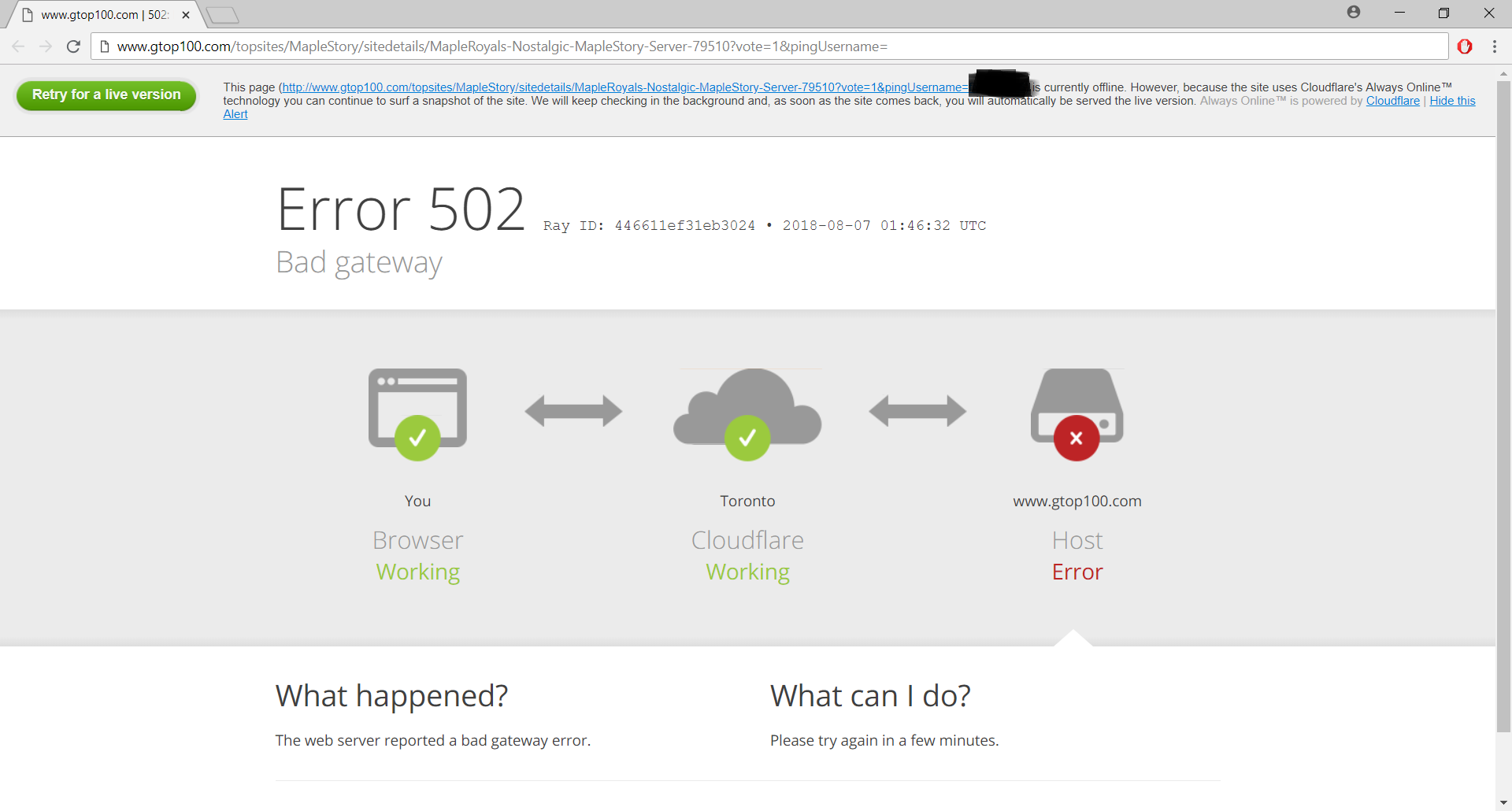 Details: Since the Gtop100 website issue, I have been unable to vote at all. I consistently get a Error 502 Bad Gateway message. At first, I thought it seemed like a region issue (I'm from Ontario, Canada) but recently, I've been told people from Canada are successfully able to vote. Just wondering if there's anything that can be done or if I'll have to play without being able to get nx ever again haha.