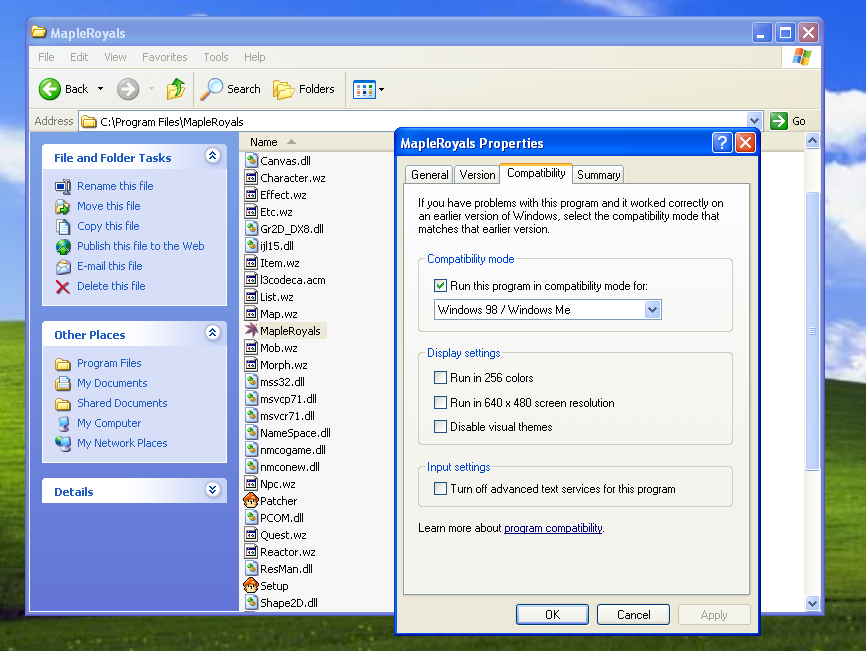 Unfortunately, I don't think those instructions apply to windows XP, since there is no option for running as administrator or changing settings for all users When you do anything to change the compatibility for Royals, it will always go back to Windows 98/Windows ME