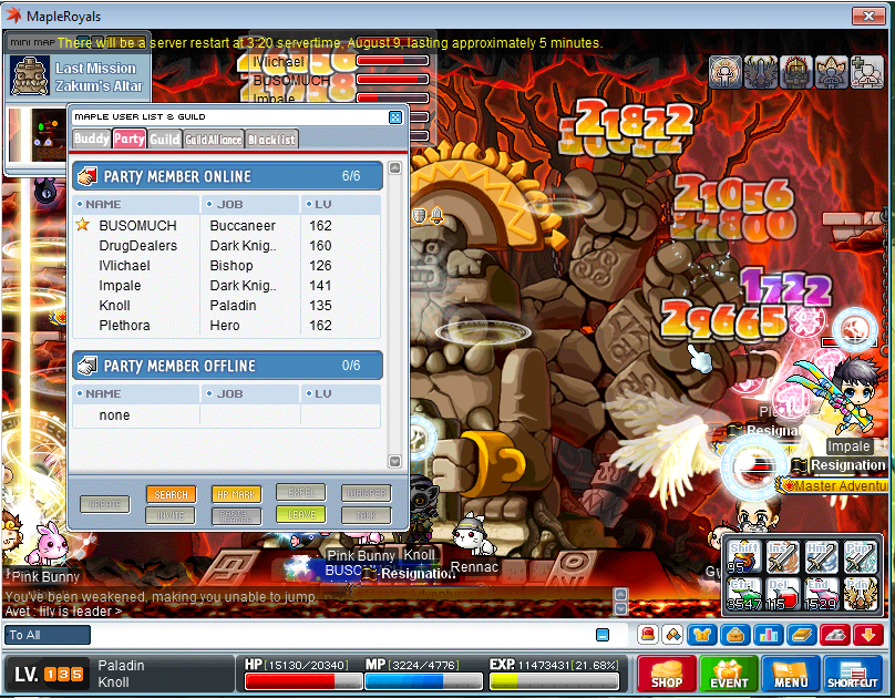 IGN: Knoll Problem: Zak rewarp Details:We were on last body, SS show both parties. Plethora, Knoll, BUSOMUCH, DrugDealers, iviichael, Impale, Aaon, Avet, Credits, Vergeontears were the memebers in the parties